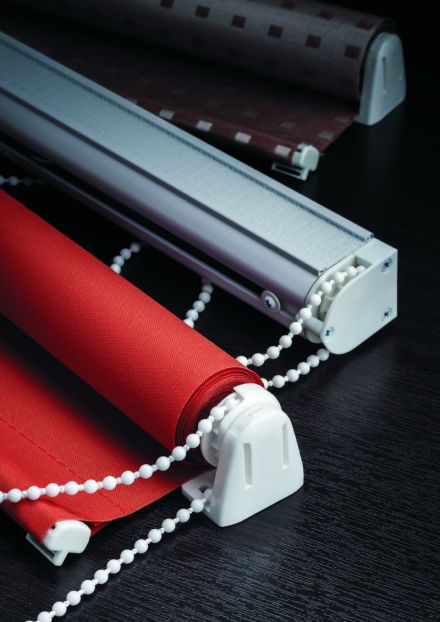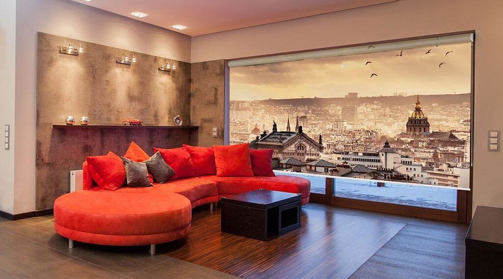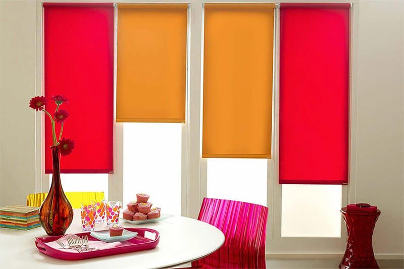 Для того, щоб підкреслити стильний сучасний інтер'єр, вибирають однотонні тканинні ролети щільного яскравого кольору. Вони можуть бути в єдиній кольоровій гамі приміщення, або ж в контрасті. Рулонні штори в інтер'єрі червоного, чорного, синього, бузкового, помаранчевого кольору виглядають ефектно і стильно.