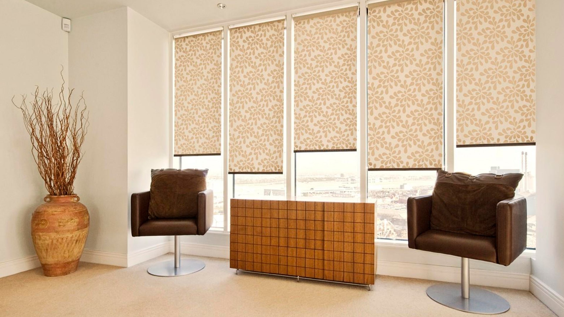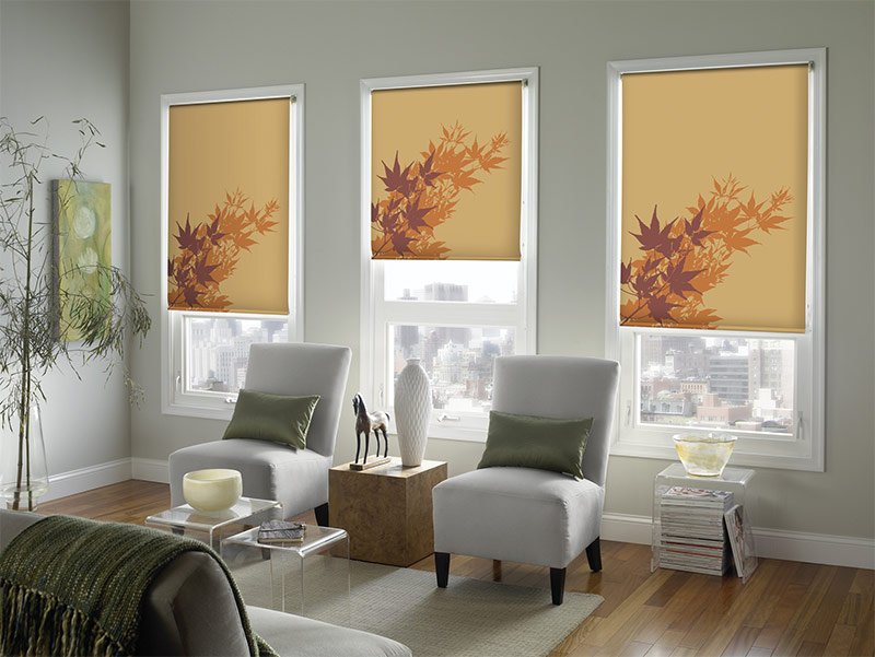 Тканинні ролети з геометричним або рослинним візерунком найкраще підходять в таких випадках: коли все оздоблення та меблі мають однотонну структуру, і тільки штори привертають увагу візерунком;